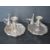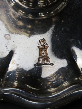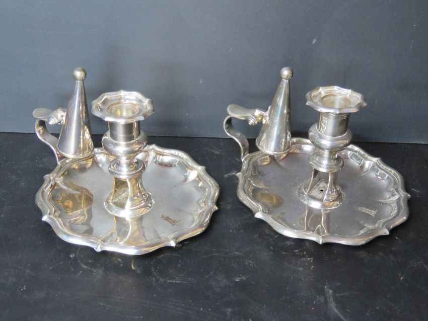 A pair of silver plated chamber sticks, each with snuffer and having emblem upon.
