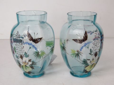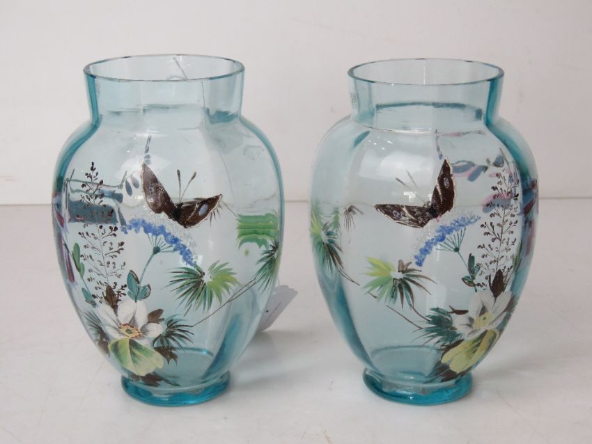 A delightful pair of pale blue glass hand painted vases, each decorated with butterflies and flowers and standing 14cm high.