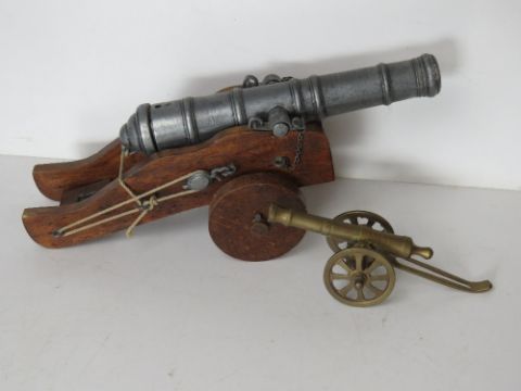 A decorative tabletop cannon having wooden base together with a smaller brass tabletop cannon. Two items.