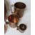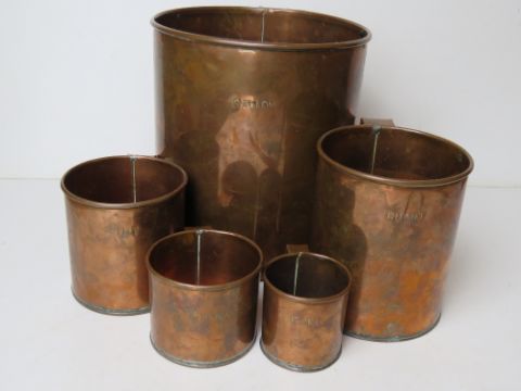 A set of five graduated copper measuring cups being gallon, quart, pint, half pint and gill.