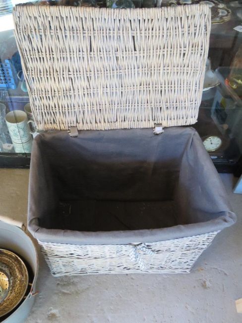 A grey wicker lidded laundry basket together with a white metal notice board, a grey kindling bucket and a copper and brass colander. Four items.