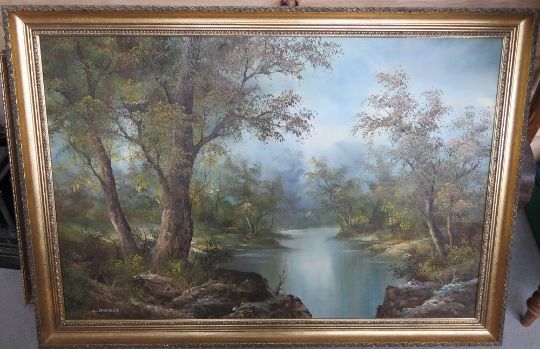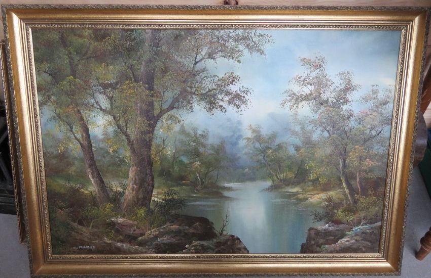 Oil on canvas; River through forest signed C.Inness, measuring 90 x 60cm within frame, 101 x 71cm overall size.