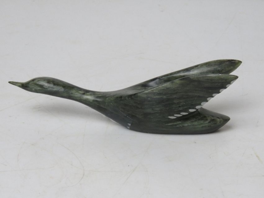 An Inuit green soapstone carving of a bird taking flight, signed to base indistinct M? Par? and measuring approx 16cm in length.