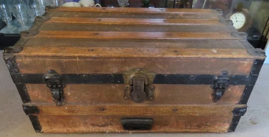 A canvas covered wooden and metal banded Navy type trunk measuring approx 69cm wide.