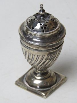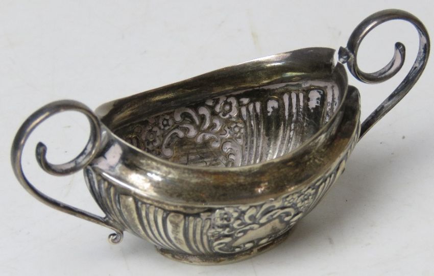 A pair of Walker & Hall HM silver salts having repoussé floral design upon, one handle a/f, hallmarked for Sheffield 1902. Together with a pepperette hallmarked for Birmingham (a/f) and a white metal spoon, no apparent hallmarks. Total weight 74.4g / 2.41oz.