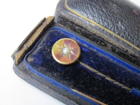 A 15ct gold cravat pin having split pearl to centre, together with another cravat pin, no apparent hallmark in vintage box (box a/f).