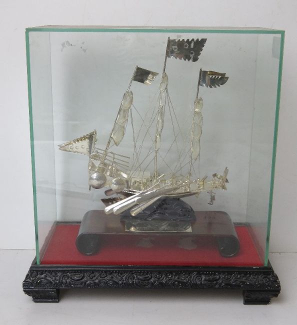 A white metal Chinese Dhow model ship having presentation inscription for 1993, all within glazed display case upon Oriental base. Case 30cm high.