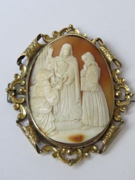 A large and impressive carved shell cameo brooch having biblical type scene upon, measuring 7.5 x 6.5cm.