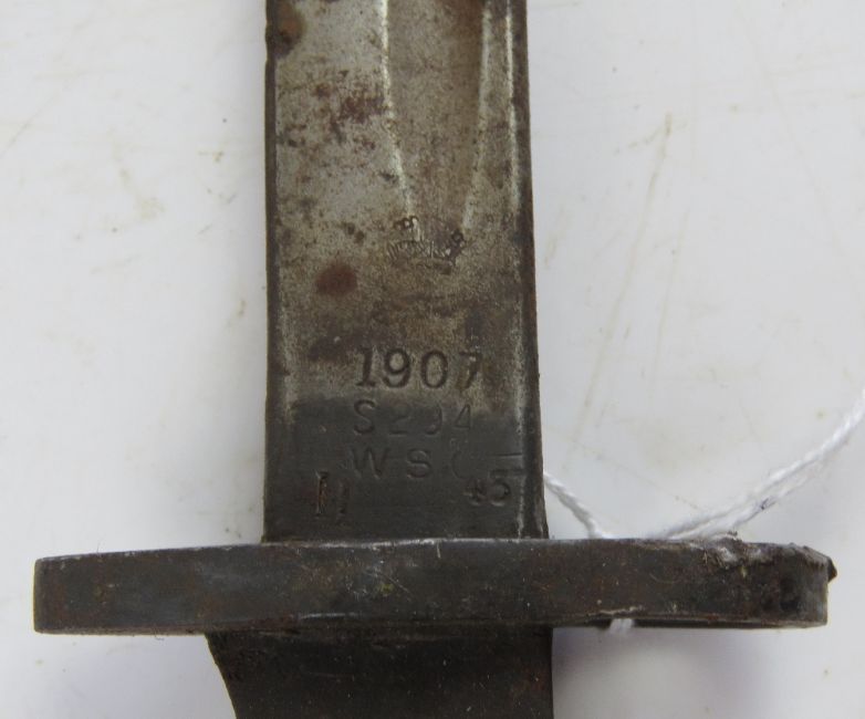A 1907 pattern SMLE bayonet with scabbard. Blade a/f.