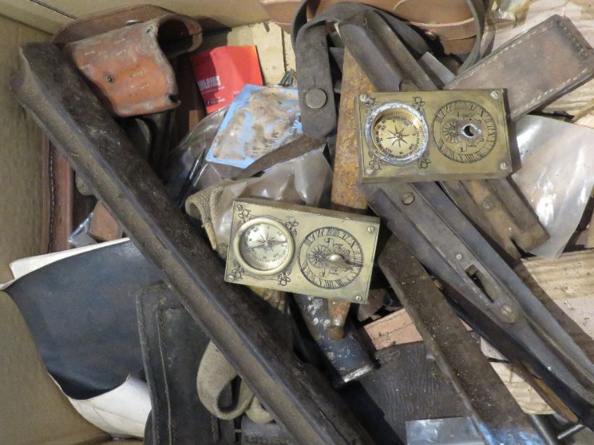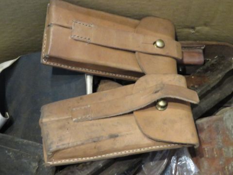 Two British helmets together with eleven pistol magazine pouches, leather holster, magazine pouch, soviet book, bayonet frog, shotgun furniture, scabbards, slings, compasses, k98 winter trigger guard, knives and patches.