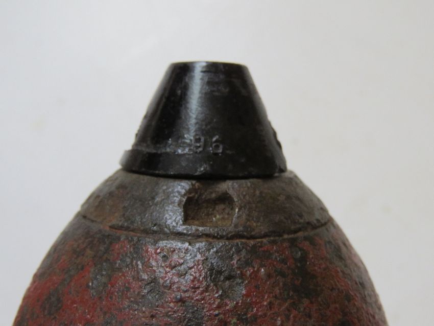 An inert WWII German 8cm Granatwerfer 34 mortar, tail and fuse unscrew, fuse dated 1944.