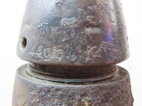 An LEIG18 7.5cm HE shell with steel fuse, with some original paint and stencilling, dated 1944, the fuse dated 1944. Dent noted to side of fuse.