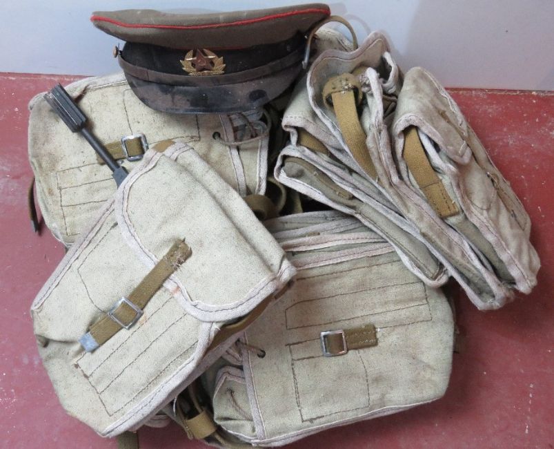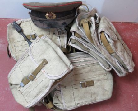 A quantity of WWII Maxim gunners pouches with a Soviet Visor cap and gunners tool.
