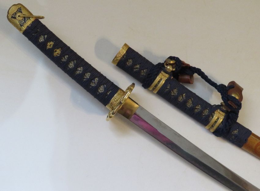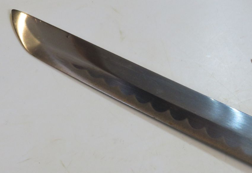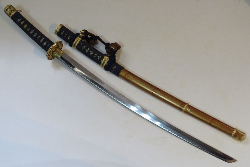 A reproduction Samurai sword with scabbard and a wavy hamon blade.