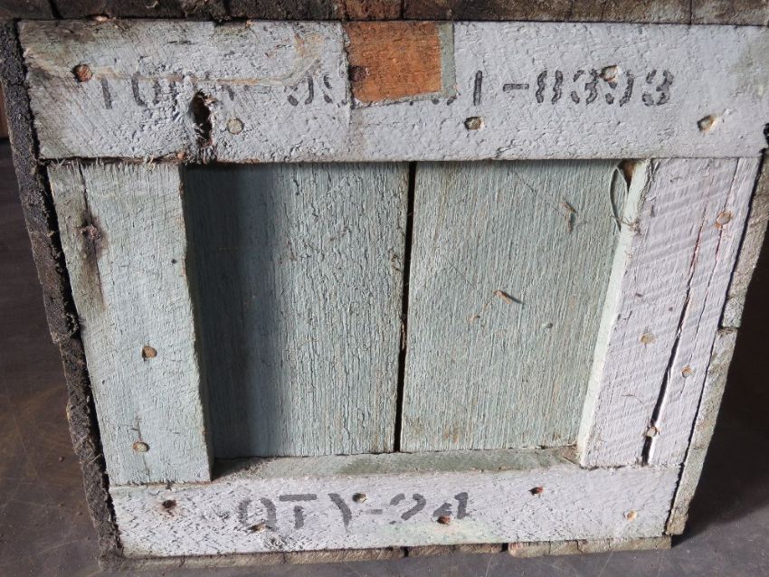 A box containing a quantity of WWII Bren .303 magazines in crate, with stencilling.