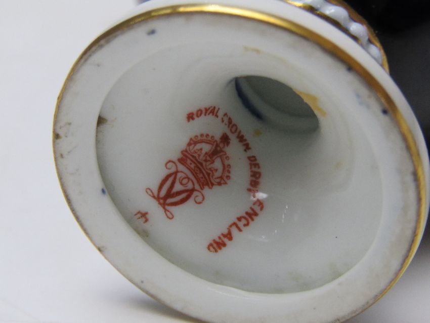 A Royal Crown Derby cobalt blue ground short urn having lake and mountain scene upon, marked C.G Pesley and standing approx 12cm high.