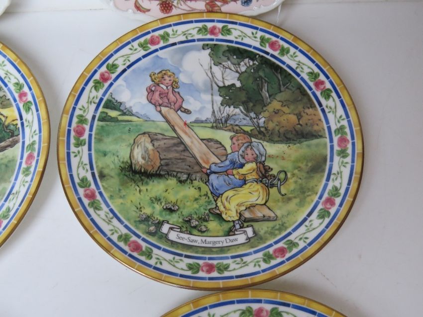 Two Royal Doulton Brambly Hedge decorative plates being Autumn and Winter. Together with four Royal Doulton nursery rhyme decorative plates. Six items.