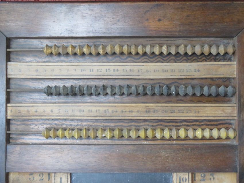An antique wall hanging snooker or pool scoreboard inc abacus bead counting rails and chalkboard. Measuring approx 62 x 76cm.