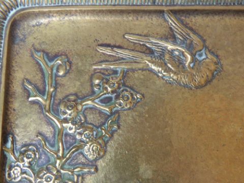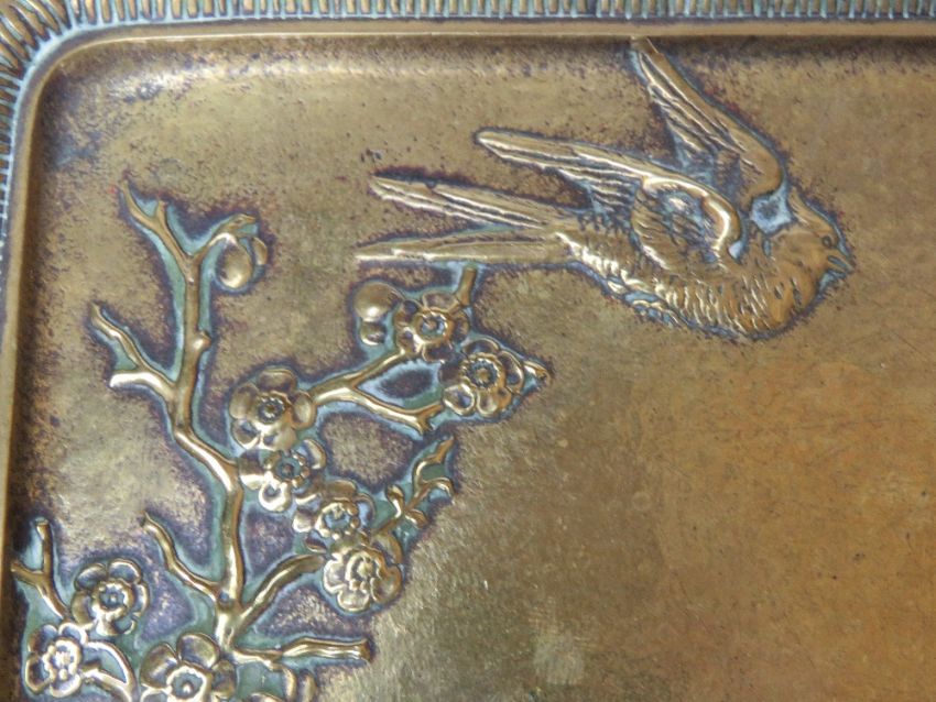 A heavy brass salver having Oriental style raised decoration upon in the form of cherry blossom, bulrushes, snake and exotic birds. Measuring approx 17.5cm wide.