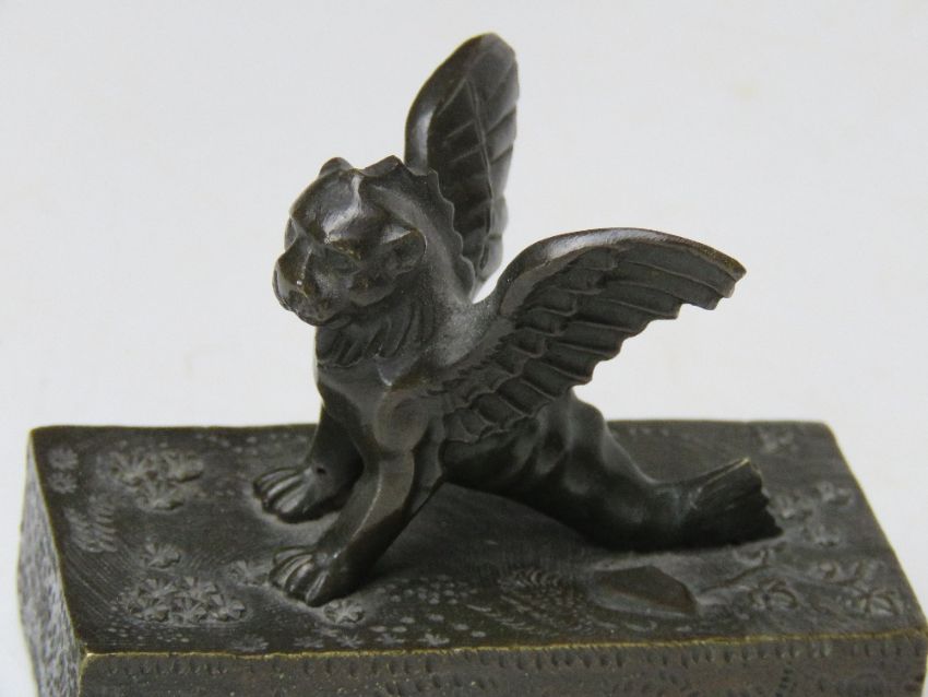 A late eighteenth / early nineteenth century bronze post finial cast as a classical Venetian Chimera as a winged lion with fish body, measuring approx 8cm wide.