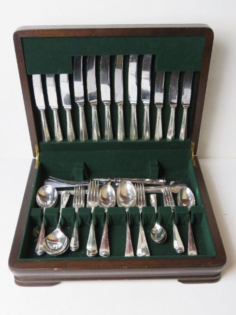 A canteen of silver plated cutlery inc carving set, knives having stainless steel blades marked for Cooper Bros & Sons.