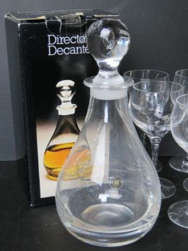 A Dartington Crystal Director's decanter in original box, together with a set of seven Dartington Crystal wine glasses.