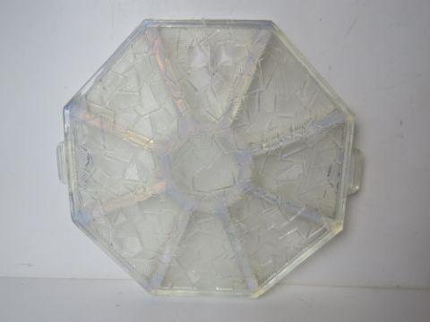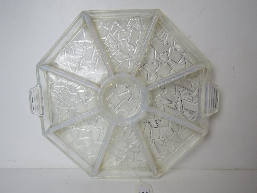 A milk glass hors d'ouvres tray having nine segments and measuring 34cm wide.