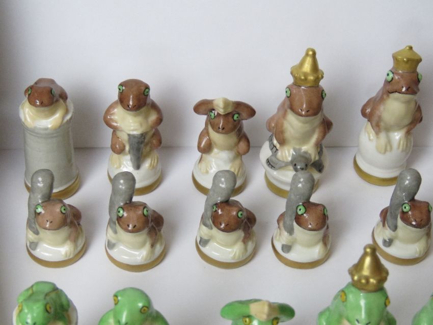A rare Rudolstadt vintage chess set; Porcelain, hand painted and part-gilded chess game, Brown frogs v Green Frogs manufactured by Ernst Bohne Rudolstadt around 1900. The figures are between 3.5 and 7cm high, within original presentation box.