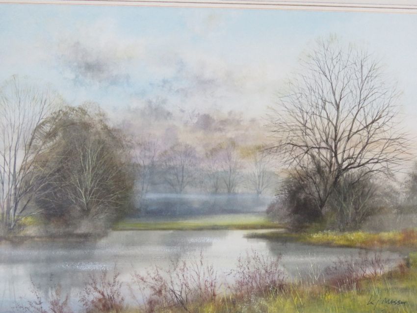 Watercolour by Ken Messer entitled Thames morning, signed lower right, sight size 43 x 30cm , framed and mounted 63 x 51cm. Bearing gallery label verso priced £275.