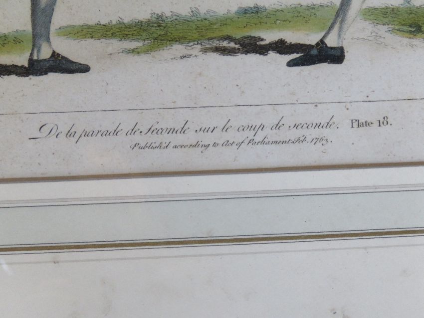 Coloured steel engraving of two dueling soldiers 'published Feb 1763' plate 18 by J Gwin Delin, framed and mounted sight size 44 x 27cm, overall size 64 x 52cm.