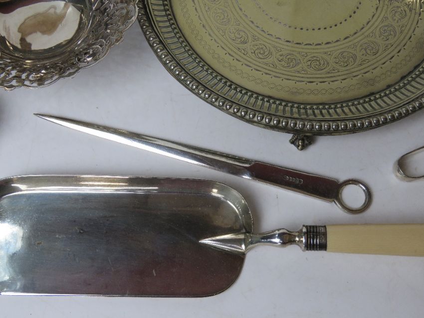 A silver plated crumb scoop having HM silver collar, together with a small quantity of assorted silver plated items inc serving tray, bon bon dish, meat skewer, etc.