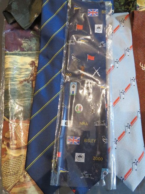 A large quantity of shooting, hunting and fishing themed ties inc Bisley NRA 2000, The Gun Trade Association, stag themes, etc.