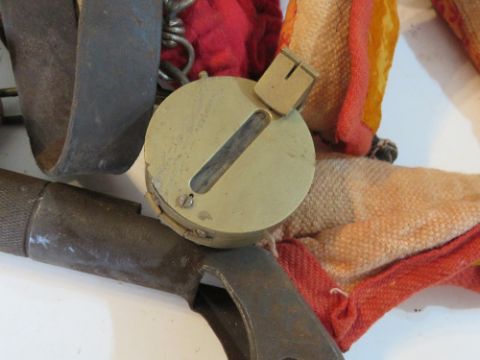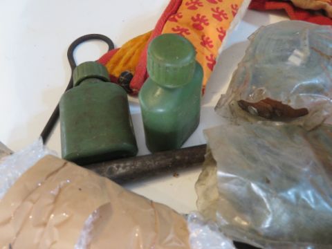 Three AKM bayonets, one blades a/f, two AK slings, leather sling, knives, oil bottles, no.4 scabbard, cleaning rod and compass.