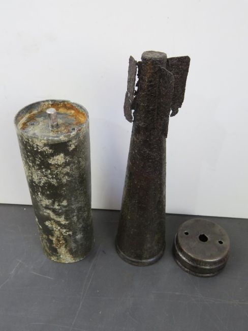 An inert Rare WWII German Kriegsmarine 6cm flare, tail in relic condition; one fin deficient. Some stencilling visible.