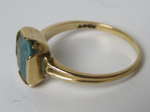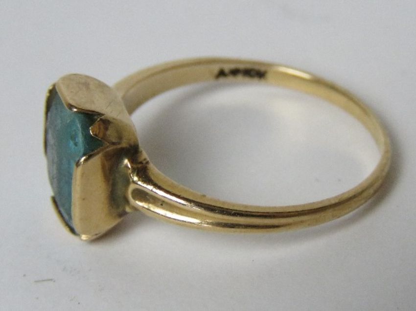 A 10ct gold Art Deco ring having central emerald cut blue stone, stone slightly a/f, size O-P, 2.8g.
