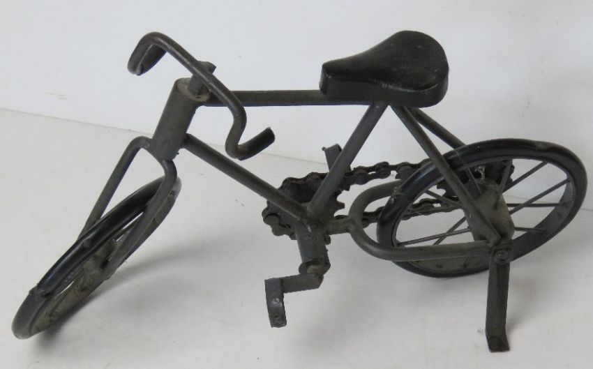 A decorative model of a bicycle having kick stand, working handle bars and turning wheels, approx 35cm in length.