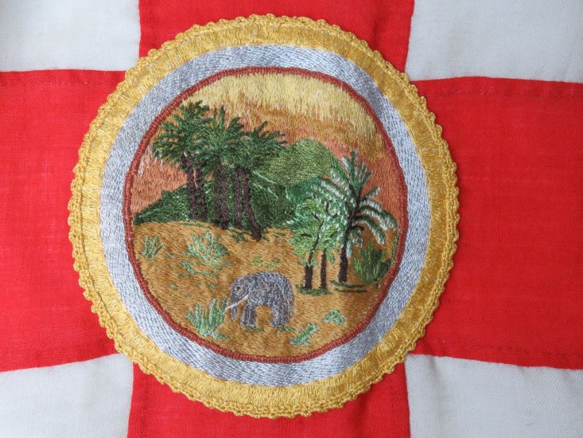 An antique English flag having hand woven tapestry to centre with initial 'M' and 1916 - 1919 India embroidered verso, measuring approx 100 x 79cm.