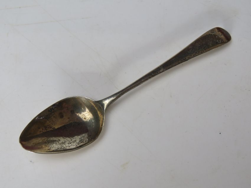 An HM silver teaspoon having late 18th/early 19thC hallmark upon. Together with a quantity of silver plated flatware inc set of six serving spoons, a boxed set of six dessert spoons with serving spoon, two pairs of sugar tongs, etc.