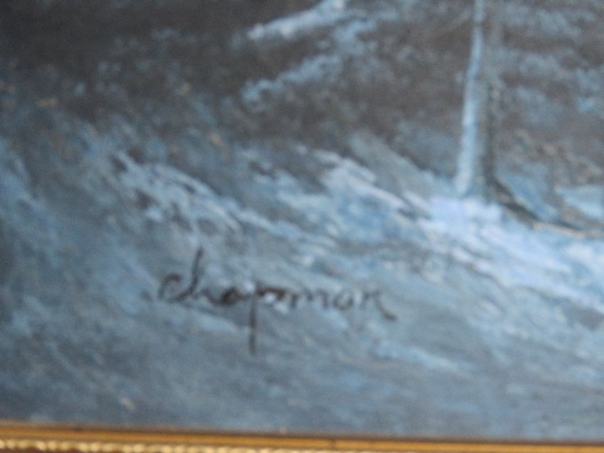 Oil on canvas; snowy evening mountainside scene, signed Chapman, 60 x 50cm, framed overall size 68 x 58cm.