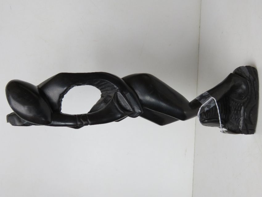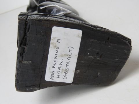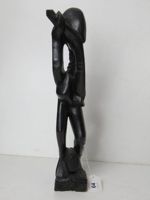 An African hard wood carving being an abstract of a man blowing a horn, standing 37cm high.