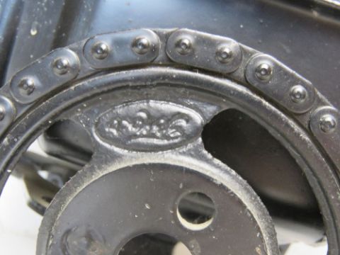 A model of a steam engine made from 'salvaged parts' inc a bike chain, approx 34cm in length.