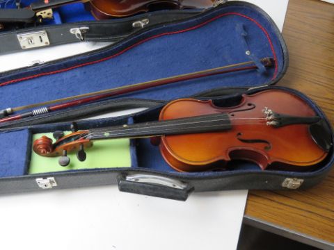 Two violins, one bearing label Michael Poller and having P&H London bow, in case, the other bearing label for Rosetti, a/f, with bow, in case.