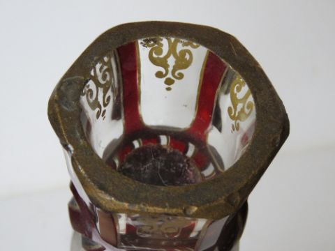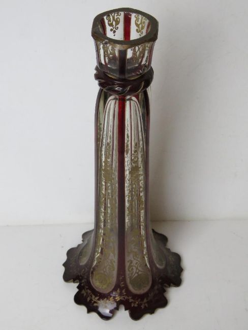 A single ruby and clear glass gilded candlestick having outswept column base. Together with a pair of ruby glass candlesticks, each standing approx 30cm high.