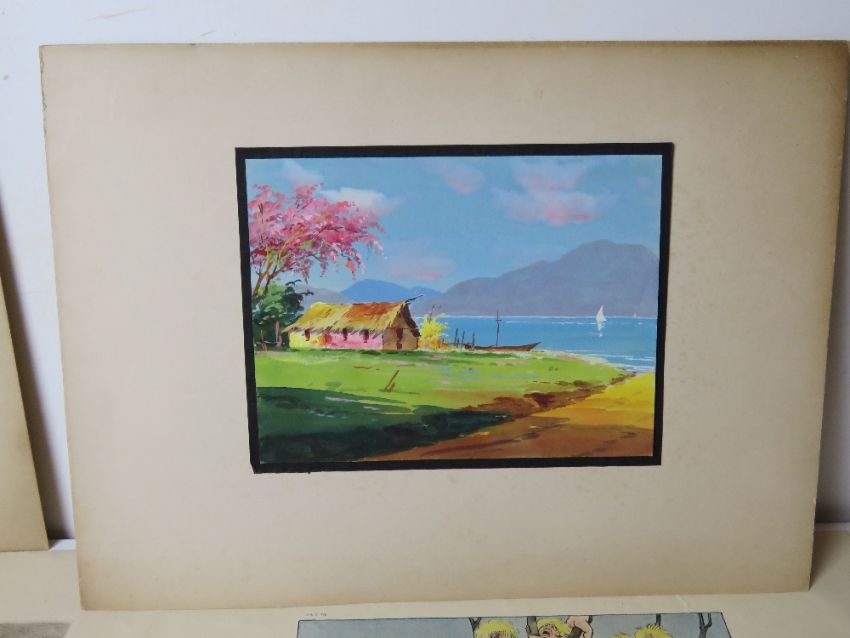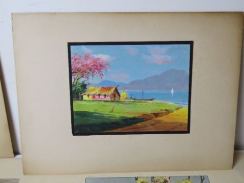 Six assorted paintings and prints including early 20th century cartoon.