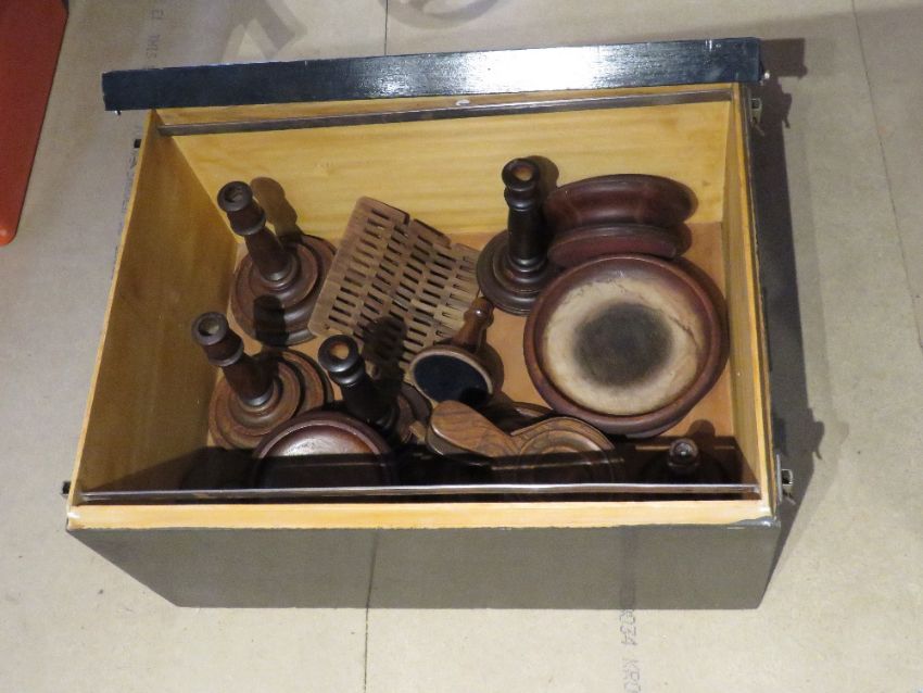 A black painted trunk opening to reveal a quantity of turned wooden items including candlesticks.