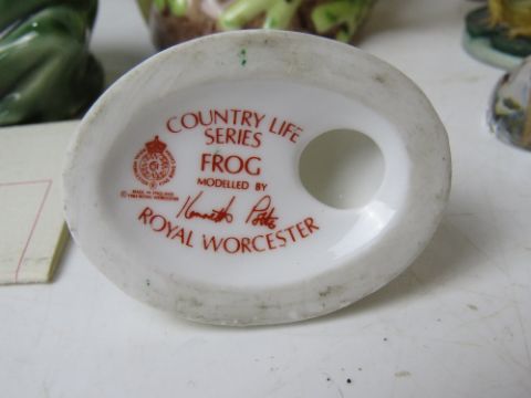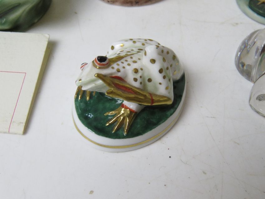 A Villeroy & Boch crystal frog figurine together with a Royal Worcester frog figurine and various other frog themed figurines.