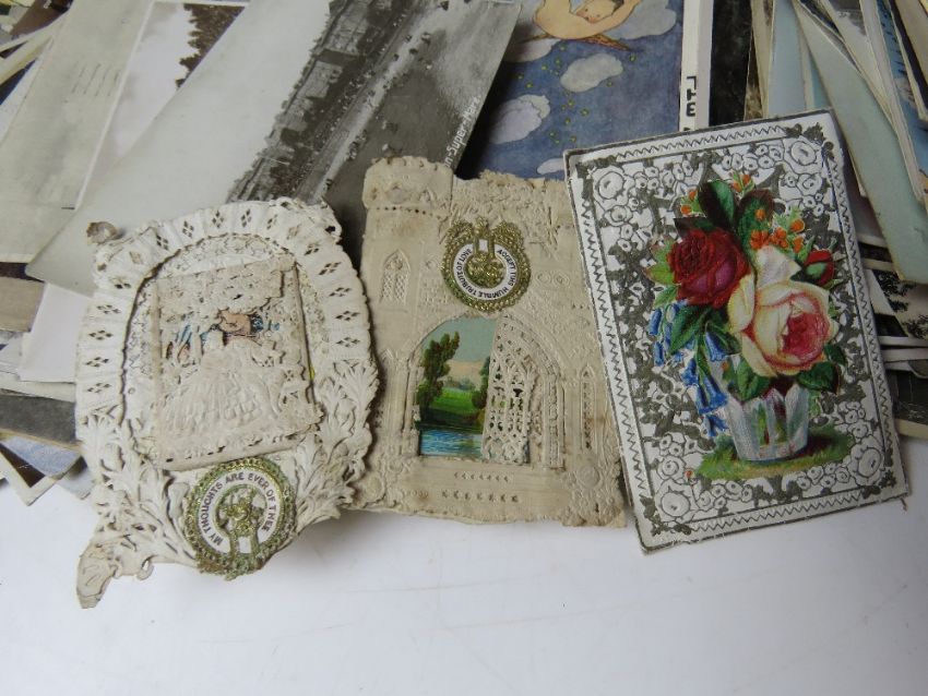 A large collection of early 20th century postcards including decoupage type sachets, novelty cards, dolls house cards, Christmas, Embroidery, Art Deco, etc.