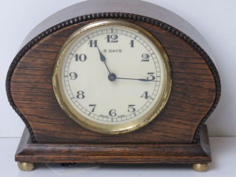 A Swiss made mantle clock having eight-day movement, cream dial with blued steel hands in wooden case raised over brass bun feet approx 18cm wide.
