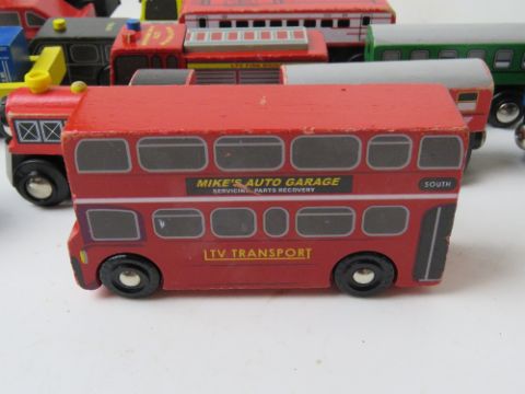 A quantity of Brio type wooden magnetic train set inc Thomas the Tank Engine and other vehicles including Police, Fire Brigade, etc.