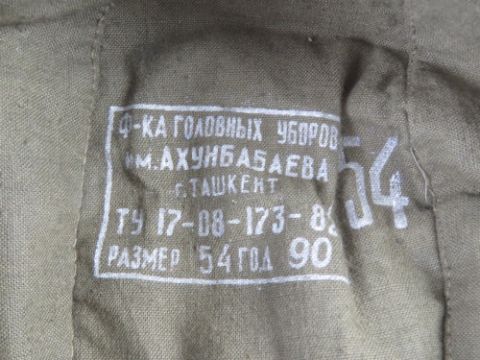 Two military ski type hats in green fabric, Russian? text and numbered 54.